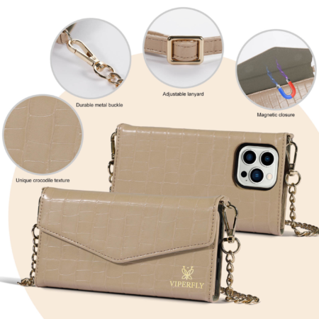 Elevate your style with the VIPERFLY Crossbody Phone Case for iPhone 15/14/13/ Pro/ Pro Max/ S24. This MagSafe-compatible, croc-textured case features a detachable magnetic wallet with RFID blocking for added security. Designed with an adjustable PU leather strap and convenient card holder, it’s perfect for hands-free, secure access to your essentials. Ideal for women seeking function, fashion, and protection in one sleek accessory