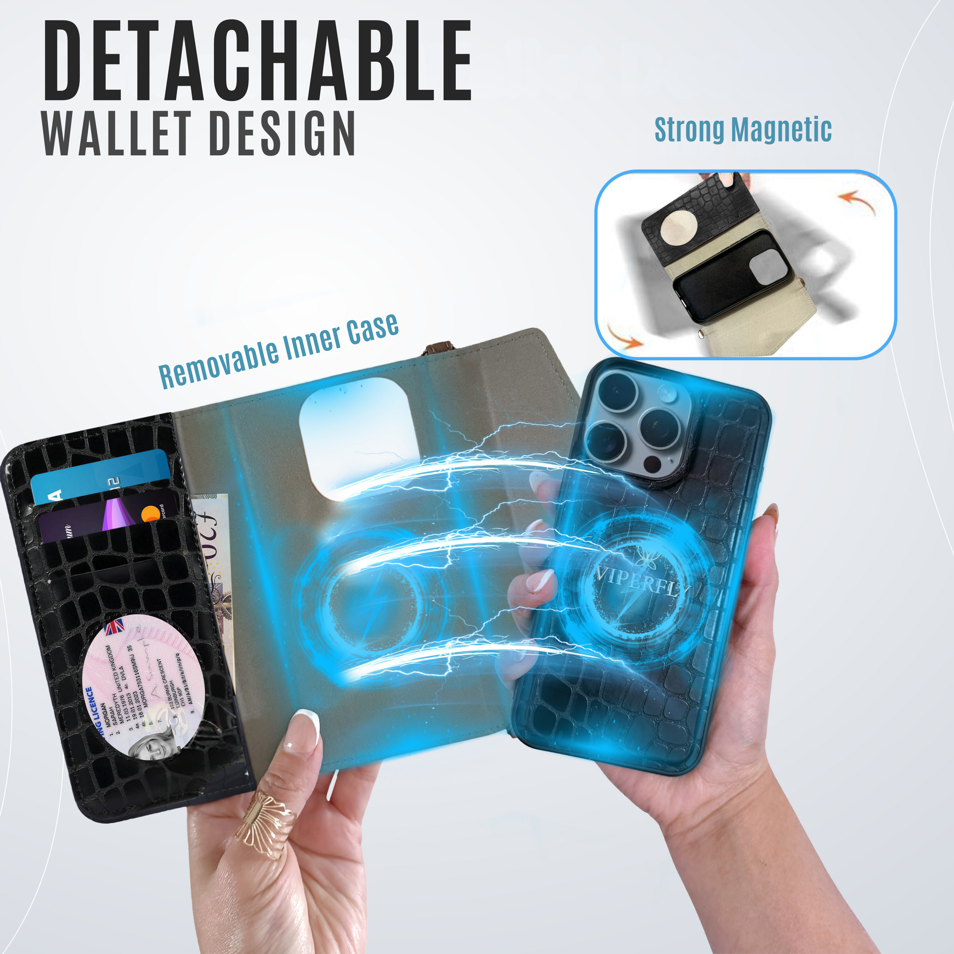 - ⛓️【Strong MAGNETIC attraction DETACHABLE CASE】This iPhone wallet case features a unique detachable 2-in-1 design. It combines a detachable lanyard case, which can be used as a delicate wallet purse or detach the case to turn it into a beautiful cocodrile leather phone case, allowing you to have both a multi-functional wallet bag and an ultra-thin phone case at the same time.
