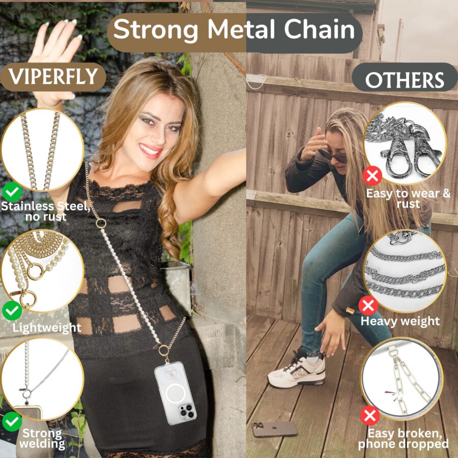 Elevate your style with the VIPERFLY 2-in-1 Stainless Steel Phone Chain. This versatile accessory easily transforms from a crossbody lanyard to a wrist strap, offering secure, rust-resistant convenience for any outfit. Made with antioxidant stainless steel for lasting durability, it’s perfect for everyday use—detach easily to switch between phone cases, or use with AirPods, handbags, or ID holders. Compatible with most phones, including iPhone and Samsung models. Add to cart for a chic, functional phone upgrade!